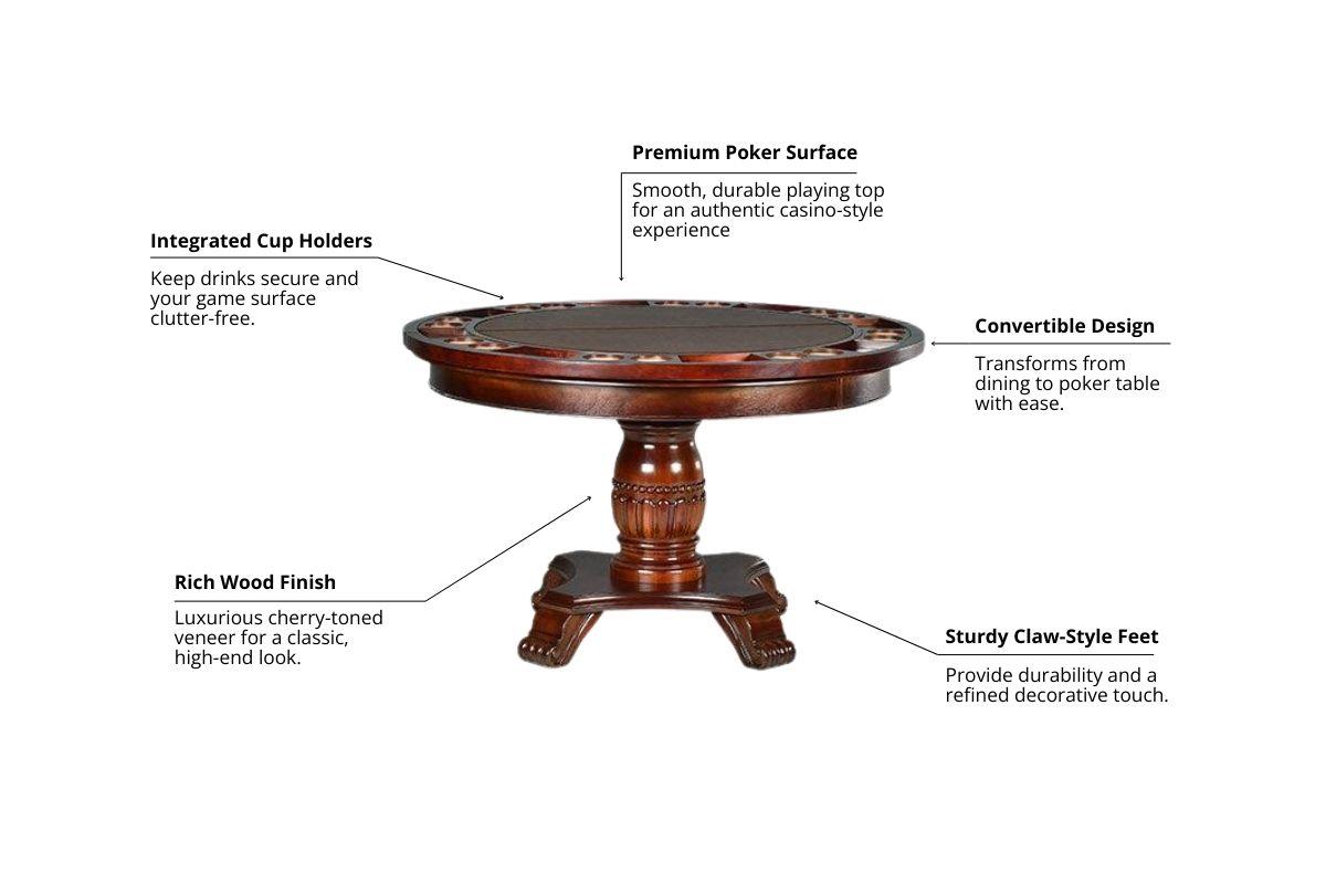 Its cherry-toned finish adds warmth and sophistication, making it a true focal point for both dining and gaming spaces. Beyond looks, it delivers personalized comfort with customizable game tops and coordinated seating options, ensuring every gathering feels tailored to your style.