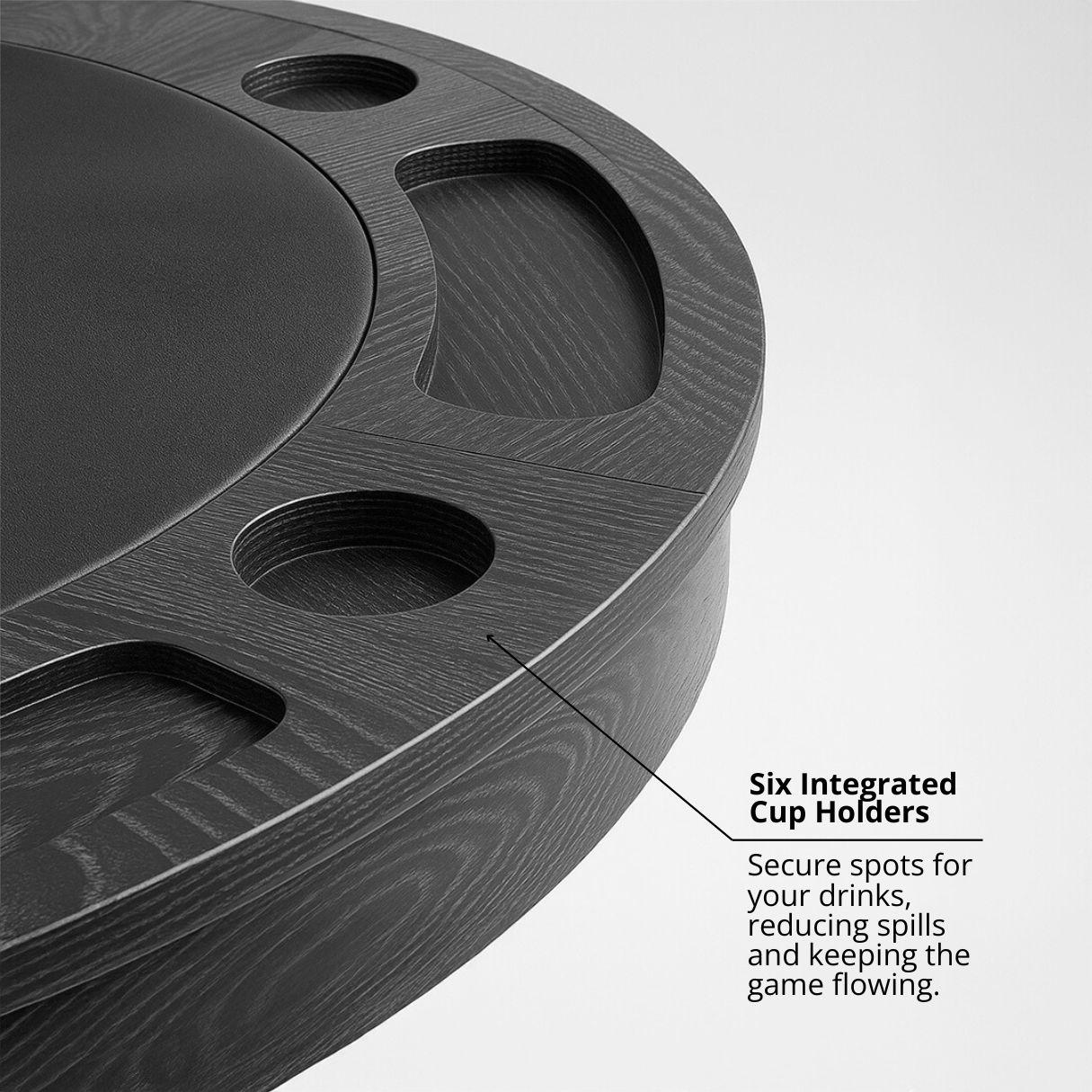 Equipped with 6 cup holders, large chip trays, and built-in storage, the Tyler Table keeps every game organized and enjoyable.